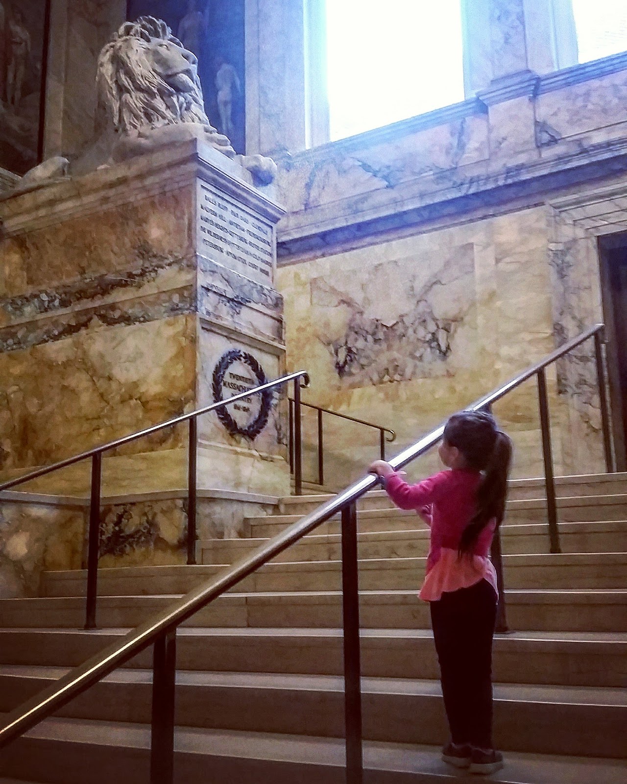 | Don't forget - libraries are also free! Persephone (grand daughter) and I exploring BPL's Central Library. |